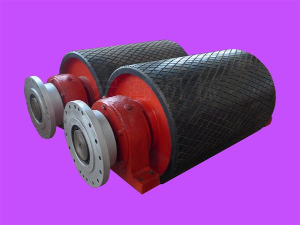 特點:傳動滾筒均在滾筒的表面冷粘貼10-15毫米厚的人字形或菱形可阻燃膠版,膠板和粘接膠的性能執(zhí)行MTB20-1999標準,滾筒采用了先進的加工技術使?jié)L筒兩端軸承的同心度≤0.05滾筒軸和筒體的連接?500毫米以下是鍵連接。?500毫米以上是漲套連接,漲套螺栓用定力矩扳手緊固,滾筒軸、滾筒體的焊縫均按國標GB10595-2009無損探傷,滾筒靜阻力系數(shù)小于0.02。